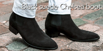 Finally, here's Manhattan, with it's sleek silhouette, higher 40mm heel, this Italian black suede chelsea boot is so versatile, pairing well with blue, black or as seen below, contrasting white jeans. It features an all-leather sole, super soft calf leather linings and other features that makes it a premium chelsea boot.