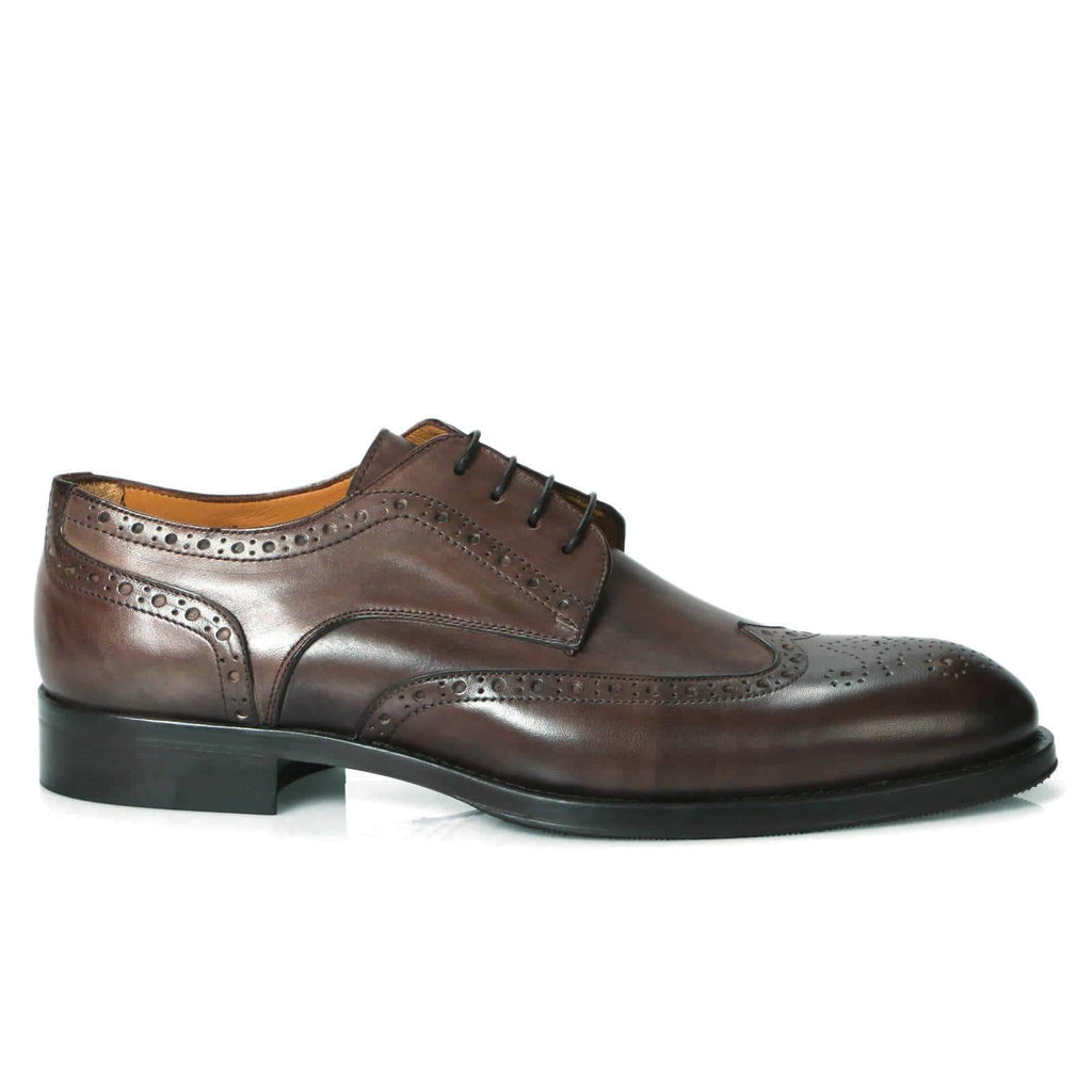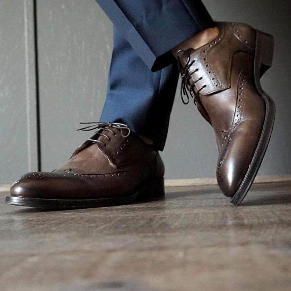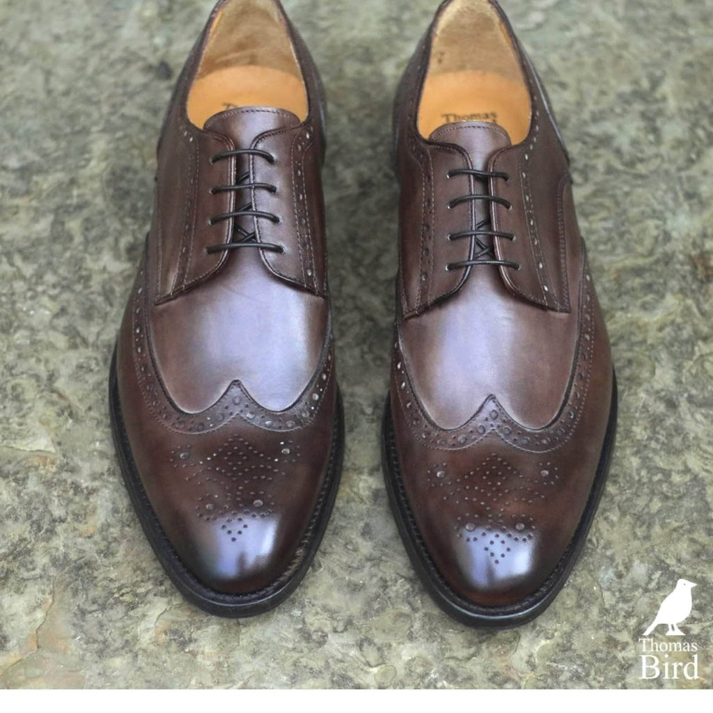 The combination of wing tip brogue and derby open lacing make this shoe perfect for relaxed and smart casual occasions. Hand burnished brown calf goes with most outfits.