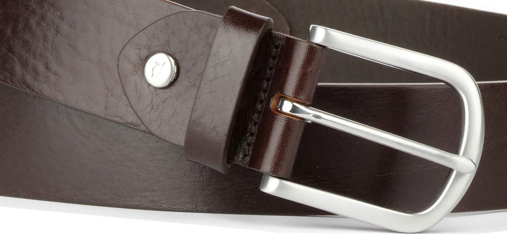 Extra wide, 38mm cut edge belt in premium, full weight brown Italian leather. Made in England, with a curved horseshoe-style brushed nickel buckle. A wider 38mm cut belt gives a relaxed, more casual look compared to our 34mm dress belts.