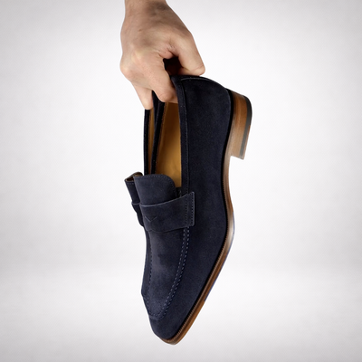 Hampton is a fresh re-design of the traditional penny loafer. Sleek, elegant lines and a chiselled toe are inspired by European/Italian styling. Navy blue suede brings a stylish pop of colour to neutral outfits.