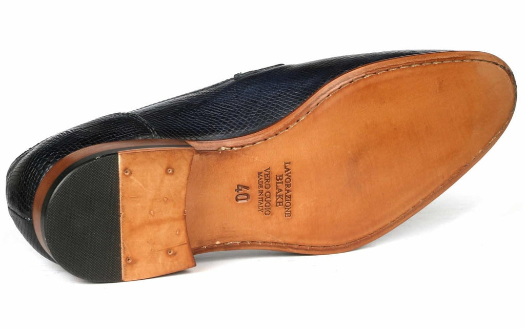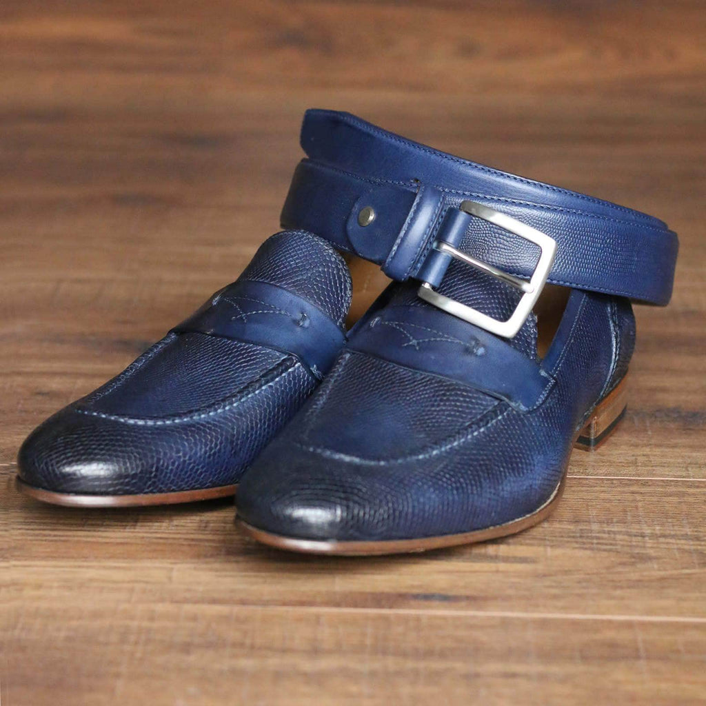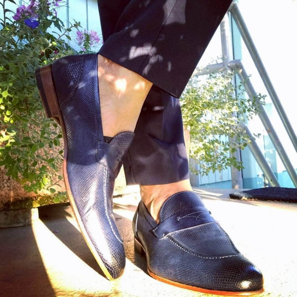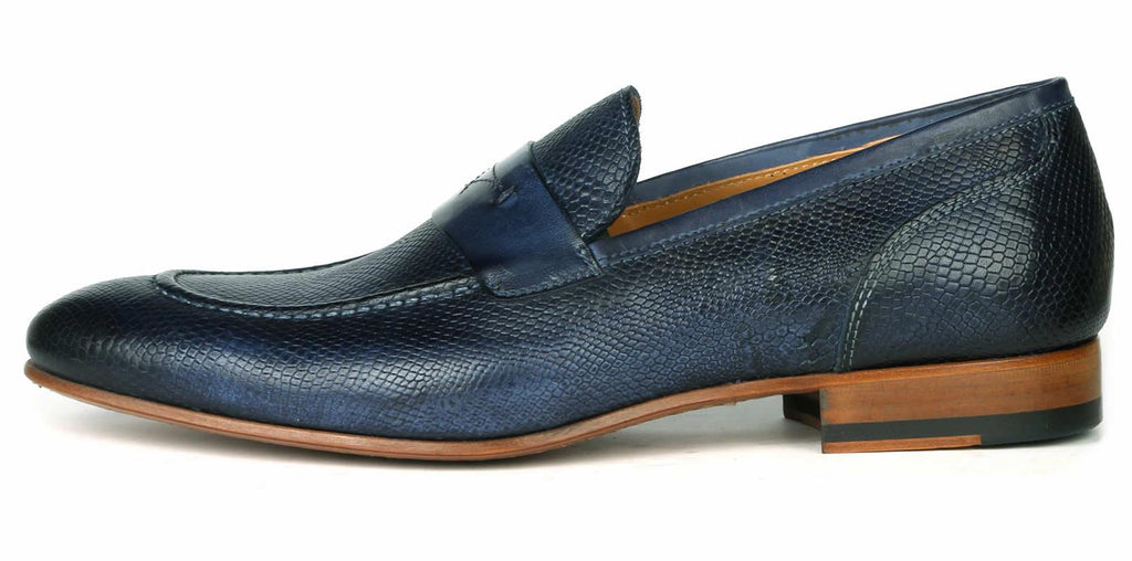 The Harrison blue snakeskin loafer is hand crafted in Italy using high quality leather and specially hand dyed to create a unique and rich brown patina. The loafer is a versatile and stylish shoe. Harrison updates the look with lines that are sleek and elegant. This version in blue snakeskin would pair well with a suit or dressed down in a more casual setting.