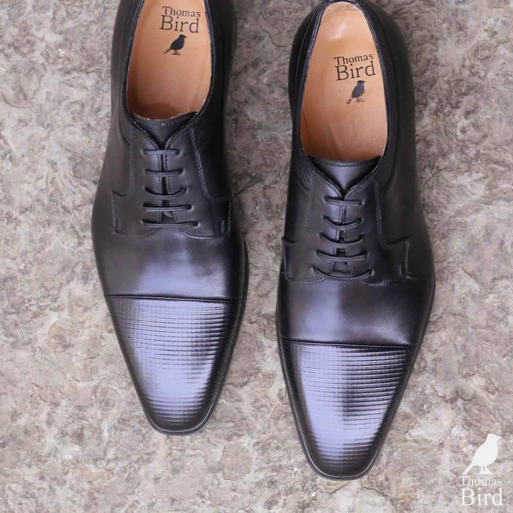 Richmond has a special weave effect capped toe, made in Italy, it is a distinctive and practical derby. A derby with a difference, this black shoe is perfect for work and smart casual occasions. Hand burnished black calf is versatile and goes with most outfits. The stitched leather sole includes a longer rubber insert to add grip and makes these wing tips last much longer before they need resoling.