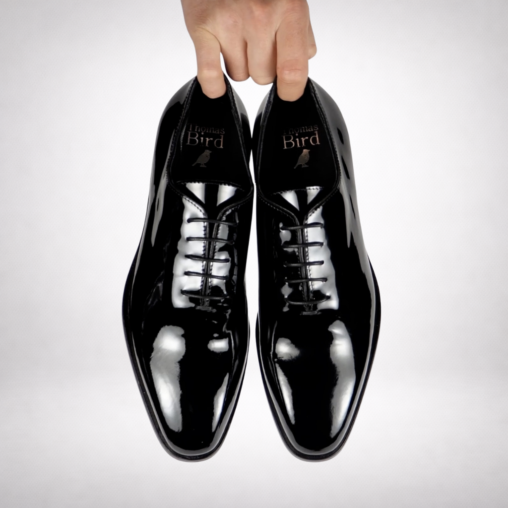 Patent leather black wholecut evening shoes, made in Italy.