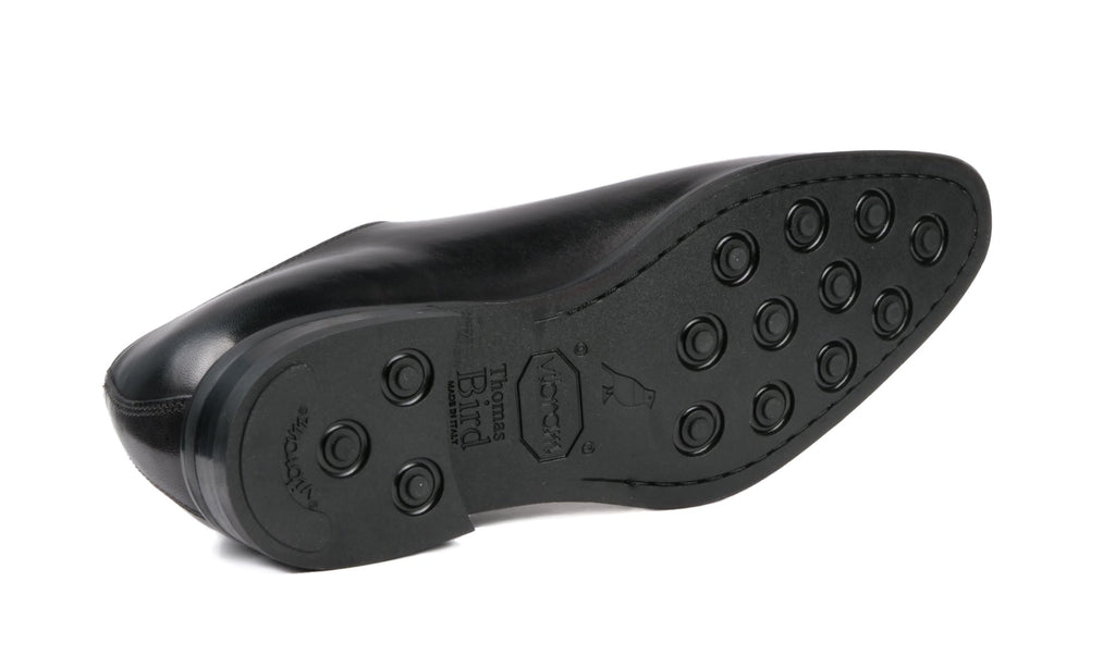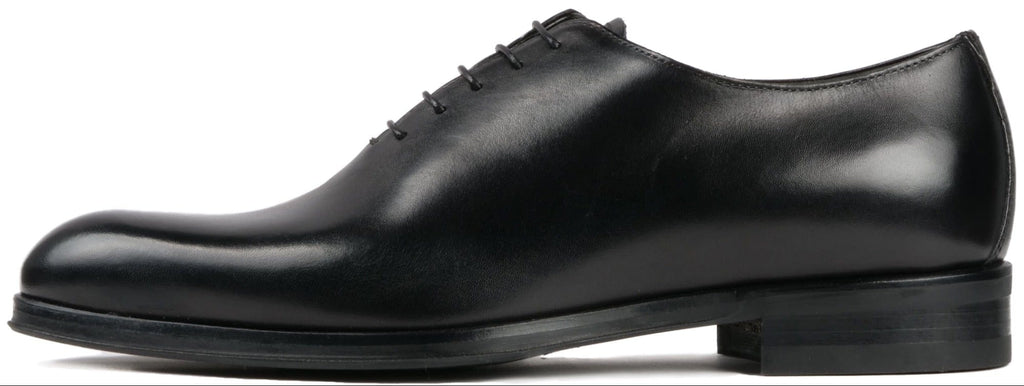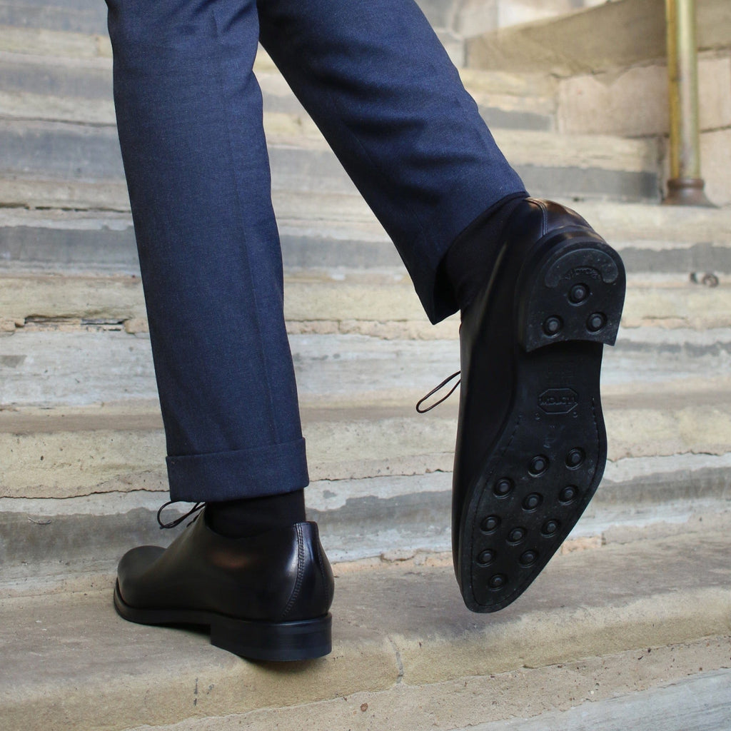 This black wholecut lace-up shoe is sleek and stylish, with a Vibram rubber sole for extra durability and grip on wet streets.