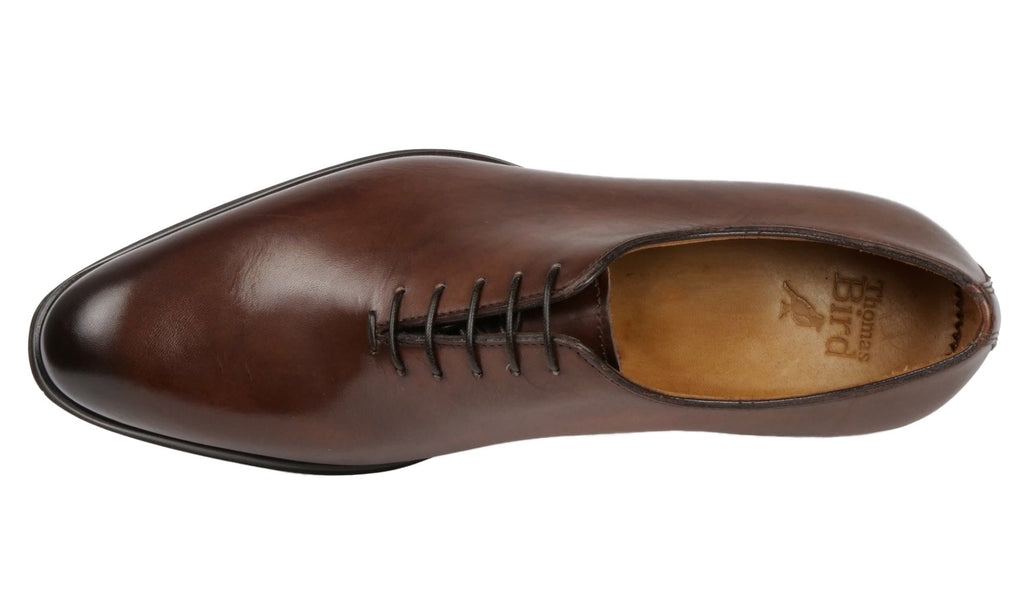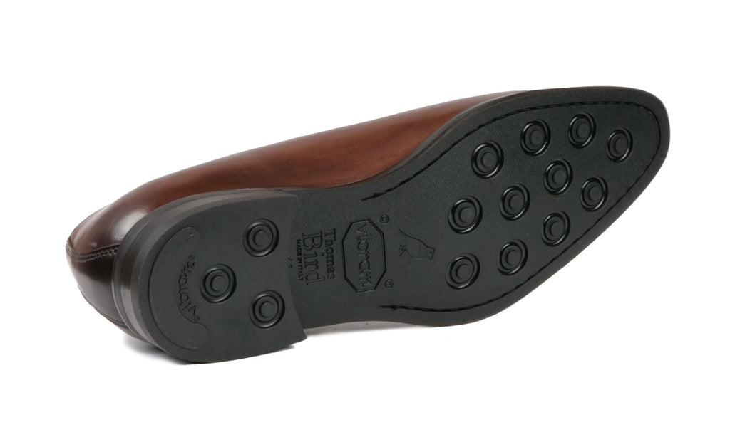 This brown wholecut lace-up shoe is sleek and stylish, with a Vibram rubber sole for extra durability and grip on wet streets.