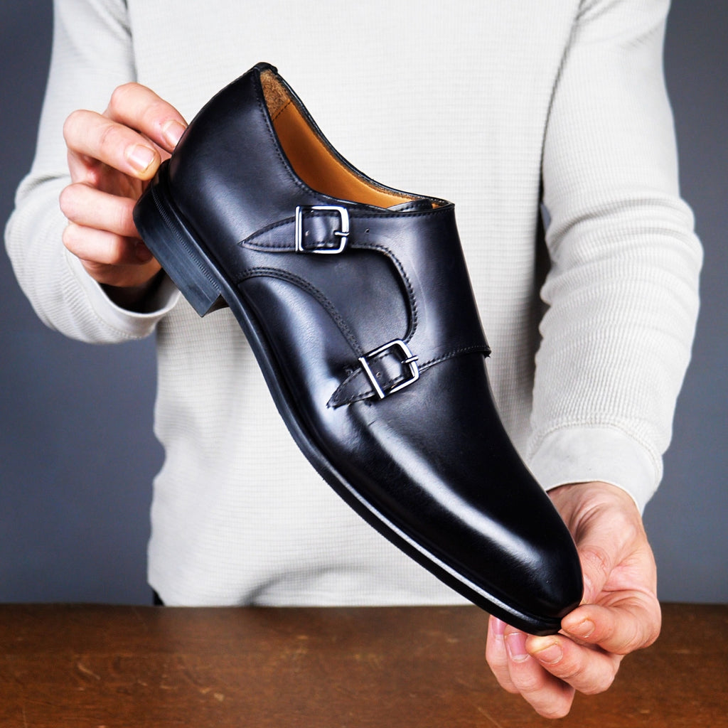 Ashcroft's twin metal buckles, leather straps and elegant lines updates a classic style. In a beautiful black finish, this offers versatility and timeless elegance.
