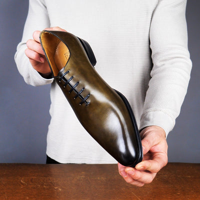 Our Benson wholecut has a sleek silhouette and slightly chiselled toe. Perhaps the ultimate dress shoe for shoe lovers, it is formal, stylish and beautiful. In a stunning olive green, this shoe adds subtle interest to any smart suit.