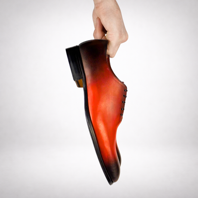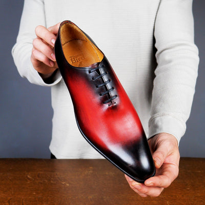 Our Benson wholecut has a sleek silhouette and slightly chiselled toe. Perhaps the ultimate dress shoe for shoe lovers, it is formal, stylish and beautiful. In a stunning custom oxblood patina, this shoe is unique and individual and adds colour and interest to grey and neutral tones.