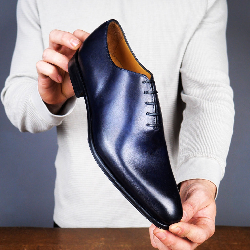 Our Benson wholecut has a sleek silhouette and slightly chiselled toe. Perhaps the ultimate dress shoe for shoe lovers, it is formal, subtle and beautiful. In a deep blue, this shoe complements perfectly grey, blue and neutral tones.