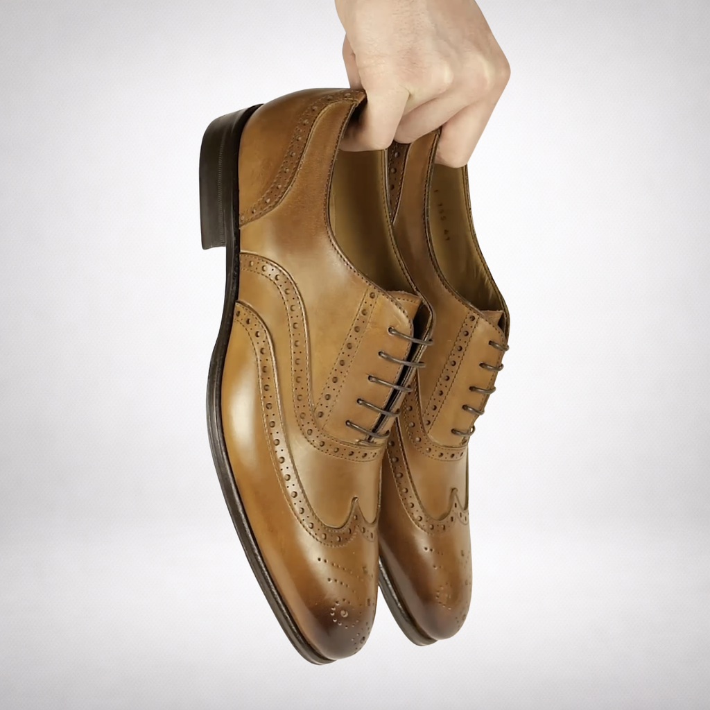 Cambridge is a classic wingtip brogue oxford with elegant lines and a rounded toe. In a soft light tan this shoe complements a formal suit perfectly or can be dressed down for a smart casual look with jeans.