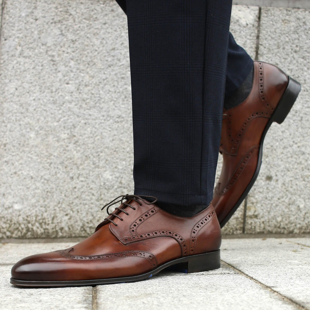 Our Italian made Madison wing tip brogue updates and enhances a classic style. The combination of wing tip brogue and derby open lacing make this shoe perfect for relaxed and smart casual occasions. Hand burnished classic tan calf works well with most colours and outfits. Photo: @chesterblogger wears them with a blue grey suit. He says: