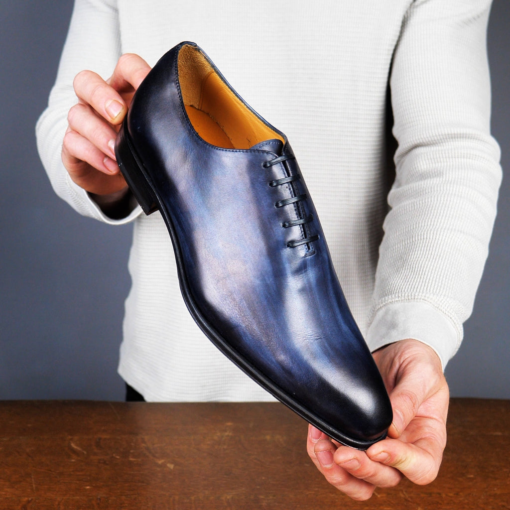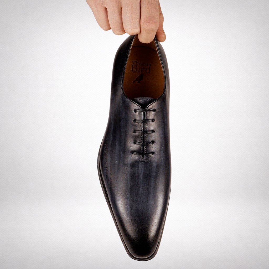 Our Benson wholecut has a sleek silhouette and slightly chiselled toe. Perhaps the ultimate dress shoe for shoe lovers, it is formal, stylish and beautiful. In a stunning polished grey patina, this shoe is unique and individual and will add a subtle interest to a dark suit.