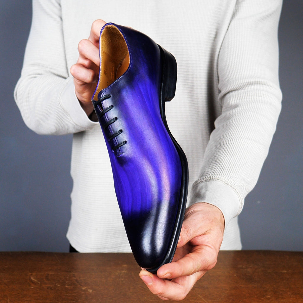 Our Benson wholecut has a sleek silhouette and slightly chiselled toe. Perhaps the ultimate dress shoe for shoe lovers, it is formal, stylish and beautiful. In a stunning custom purple patina, this shoe is unique and individual and will add that touch of colour and interest to whatever you are wearing.