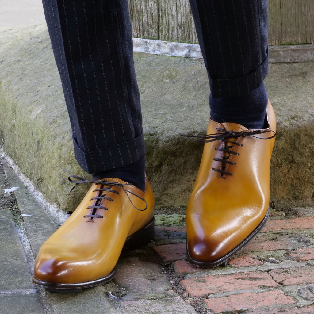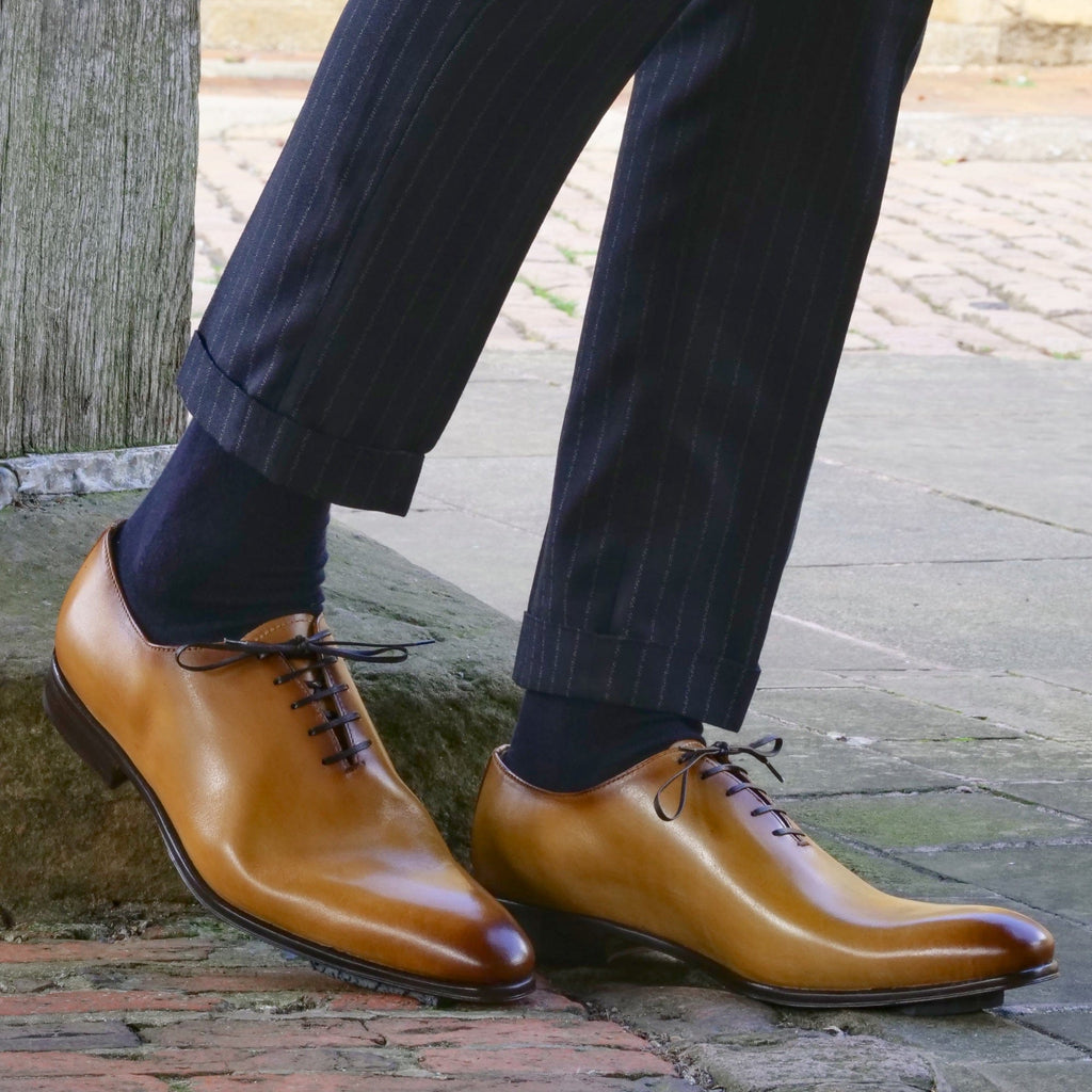 Our Benson wholecut has a sleek silhouette and slightly chiselled toe. Perhaps the ultimate dress shoe for shoe lovers, it is formal, subtle and beautiful. Light almond tan pairs perfectly with blue suits and adds warmth and interest to greys and neutrals.