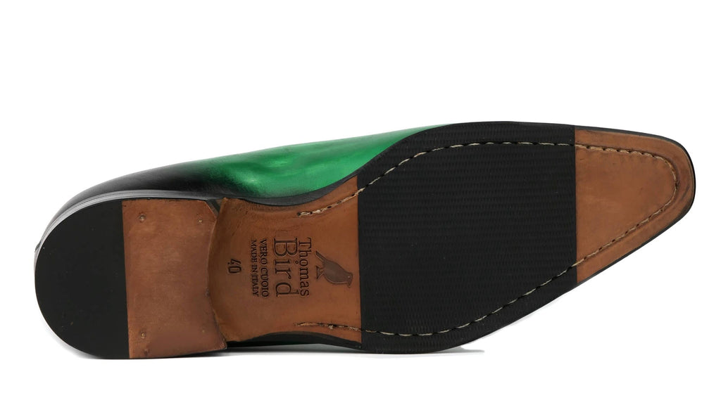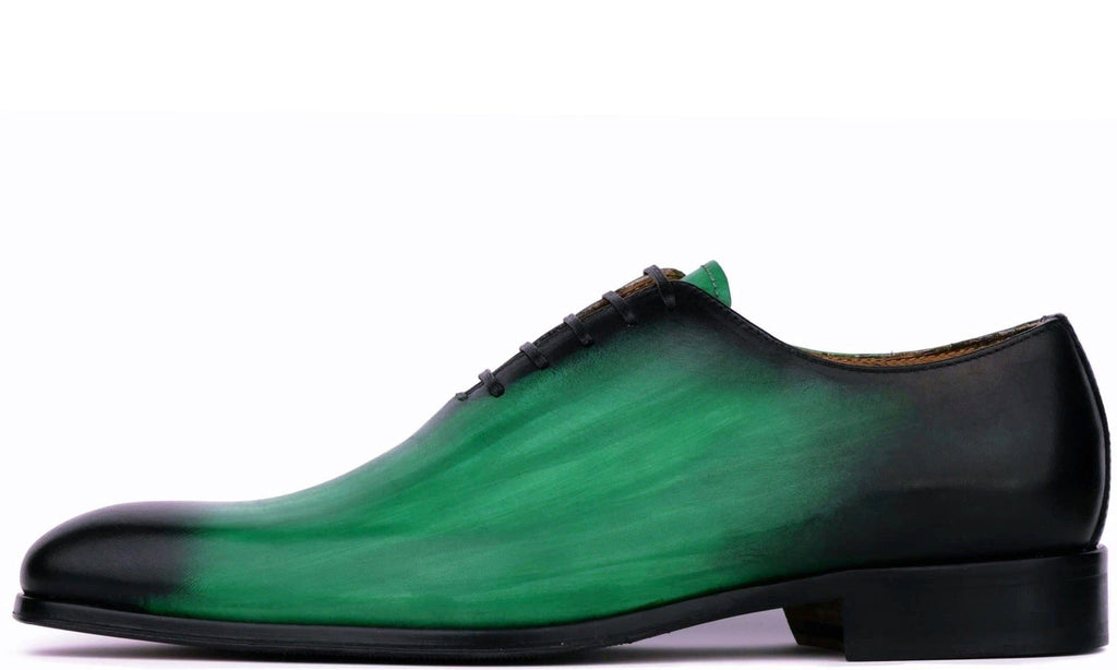 Our Benson wholecut has a sleek silhouette and slightly chiselled toe. Perhaps the ultimate dress shoe for shoe lovers, it is formal, stylish and beautiful. In a stunning custom green patina, this shoe is unique and individual and will add that touch of colour and interest to whatever you are wearing.