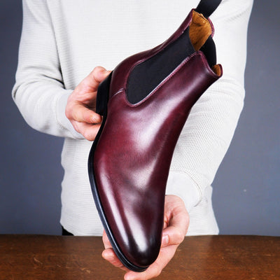 This Eastwood chelsea boot is in a very nice, hand finished oxblood patina. Oxblood looks fantastic with blue or black jeans, also chinos, and even a suit. We also have them in other colours, including oxblood, brown, blue and black, also suede including grey and tan. The colour is very rich and deep. It has been built up in layers and then waxed and polished to protect and enhance the finish.