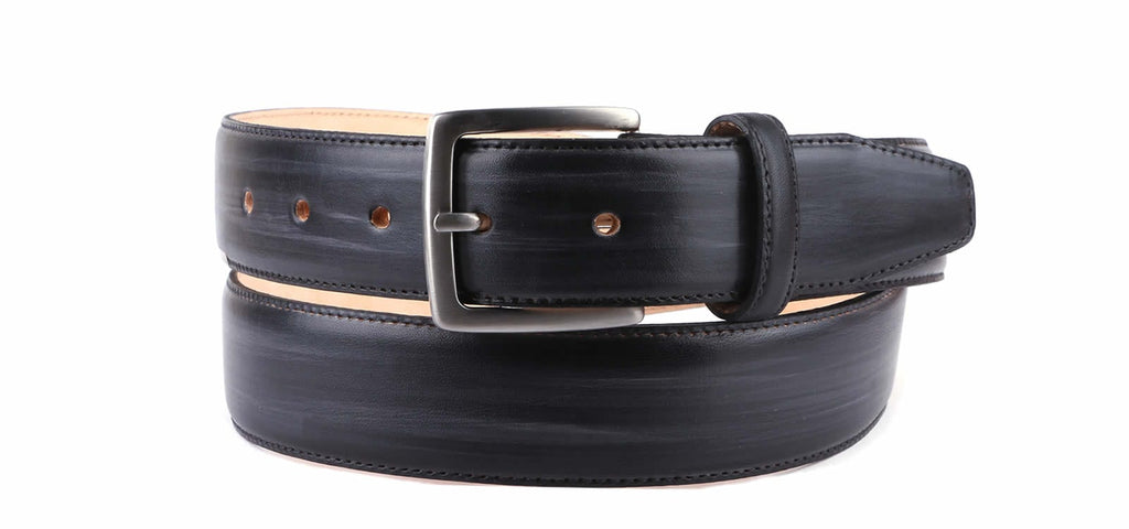 High-quality custom grey patina belt made from full grain Italian leather, dyed and hand finished to create a rich colour.