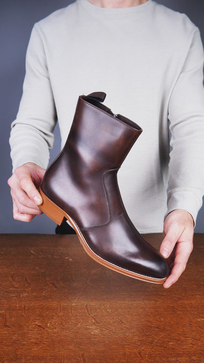 Phoenix is a beautiful Italian-crafted zip boot with style and attitude. Similar to our Memphis boot, Phoenix is a little wider with a slightly wider toe. It has a 40mm stacked heel and striking silhouette. Comfortable and versatile it can be worn casually with jeans or suited up. In premium rich brown full grain leather, this is a sleek, unique boot that will enhance any outfit.