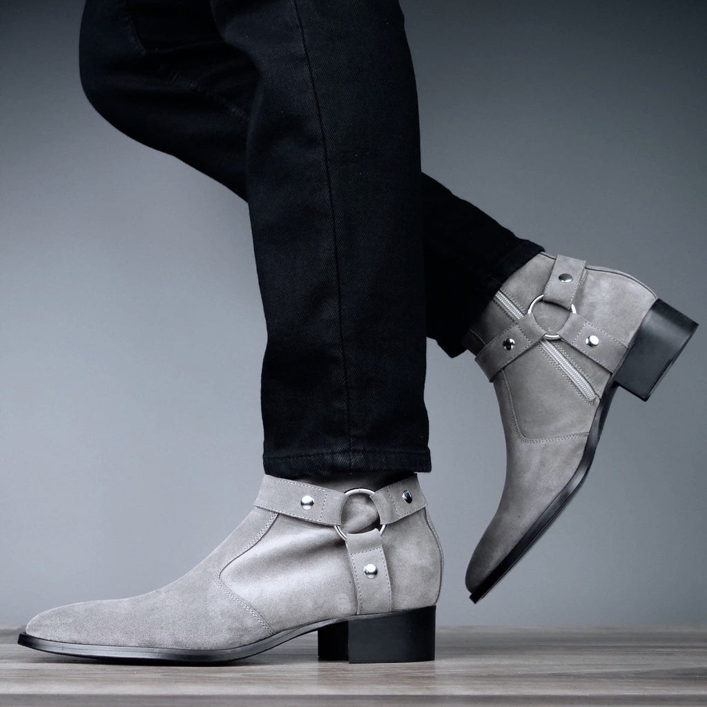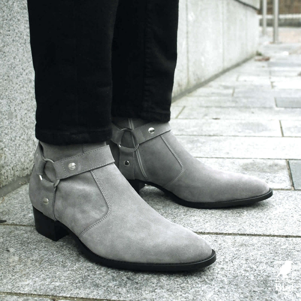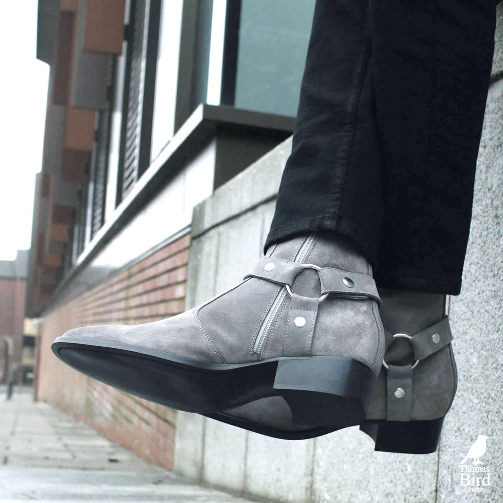 Vincent is a stunning harness boot with style and attitude. With a beautiful silhouette, it features a 4-strap harness with metal rings, side zip and 40mm stacked heel. Comfortable and sleek it can be worn casually with jeans or suited up. In premium grey suede, this is a unique and eye-catching boot that will add punch to any outfit.