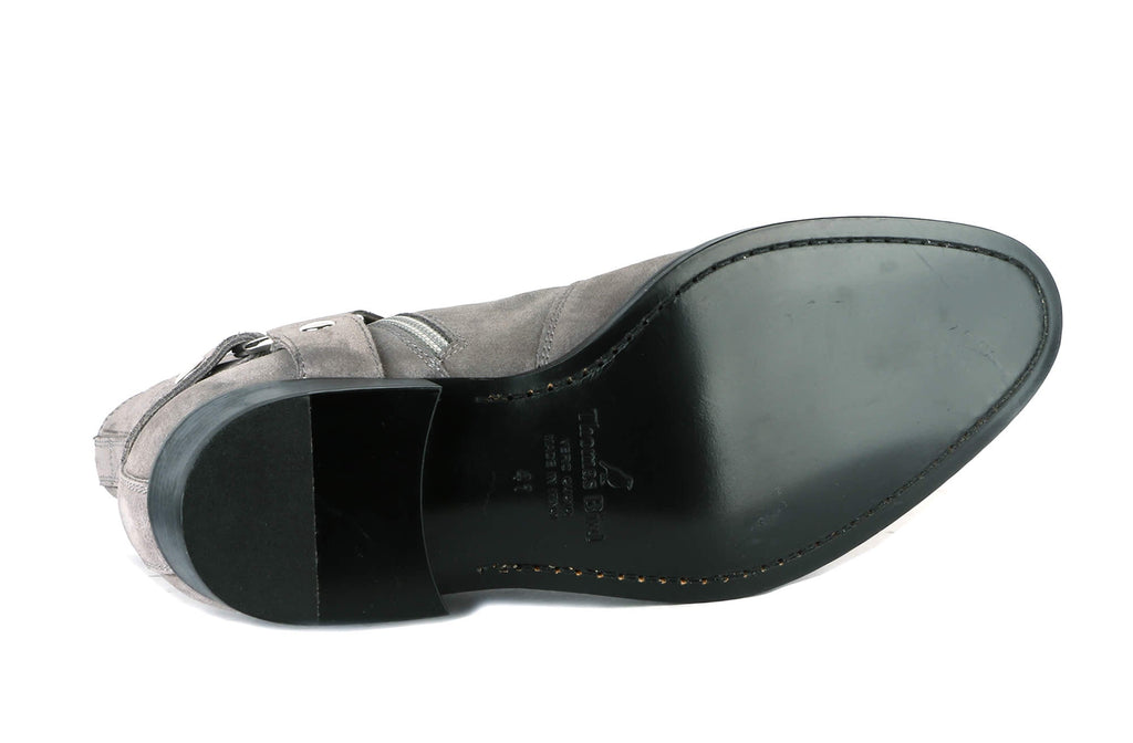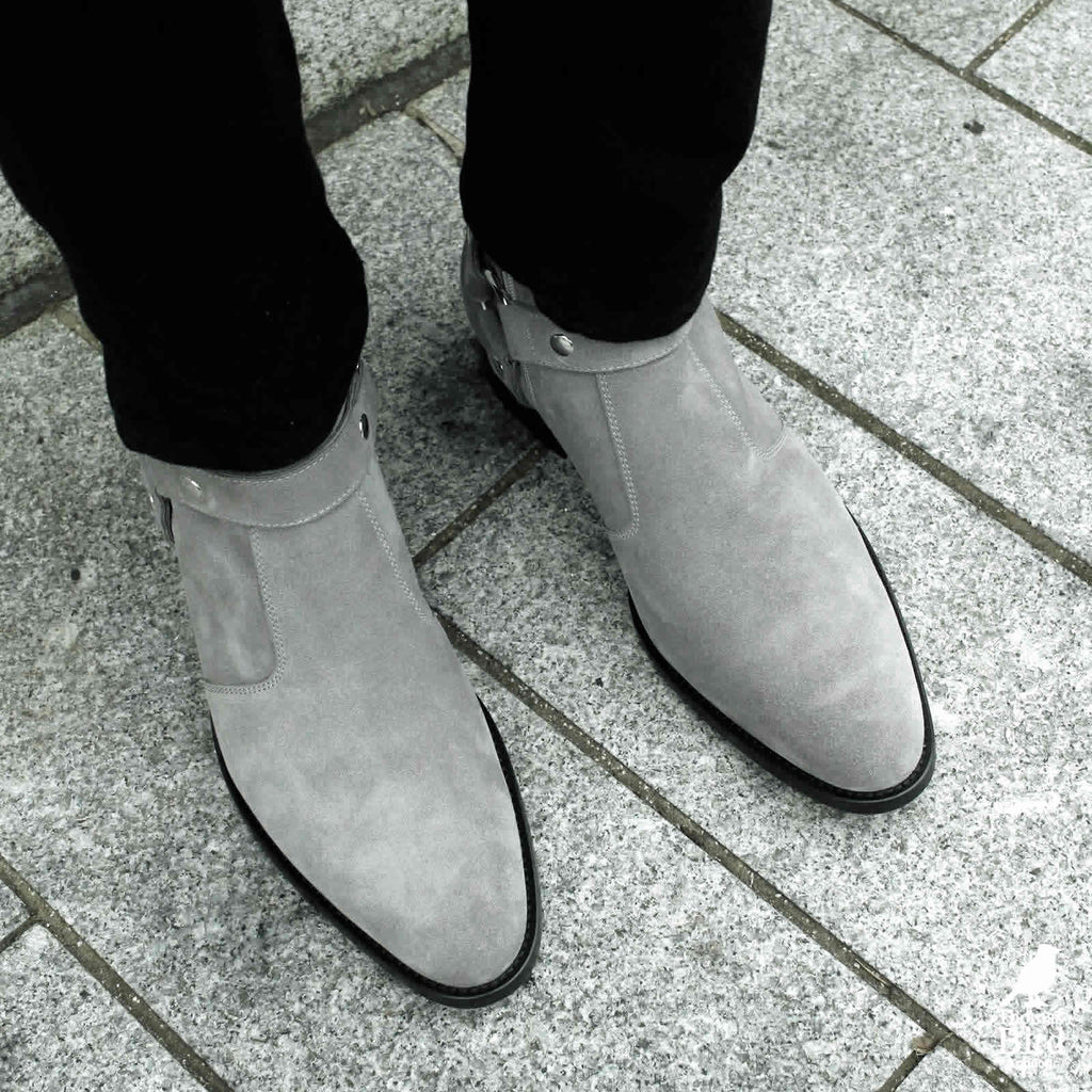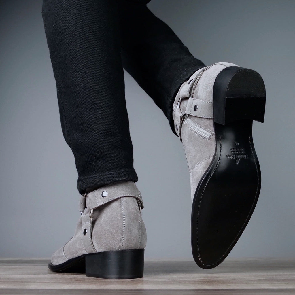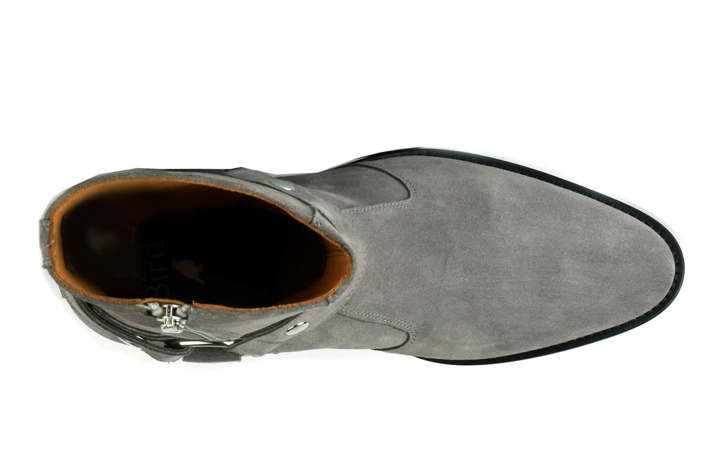 Vincent is a stunning harness boot with style and attitude. With a beautiful silhouette, it features a 4-strap harness with metal rings, side zip and 40mm stacked heel. Comfortable and sleek it can be worn casually with jeans or suited up. In premium grey suede, this is a unique and eye-catching boot that will add punch to any outfit.